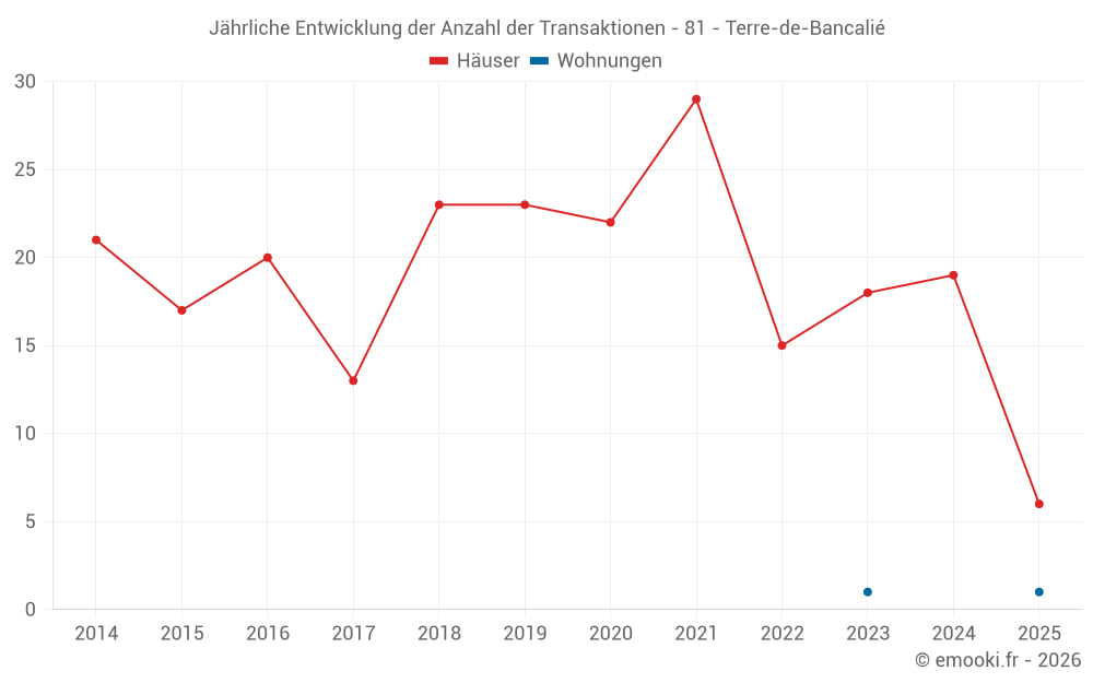 Der Durchschnittspreis auf den 16 Hausgeschäften der letzten 12 Monate in der Gemeinde Terre-de-Bancalié betrug 1 422 € pro Quadratmeter für einen mittleren Immobilienwert von 171 813 €. Über diesen Zeitraum hinweg lagen 60% der Transaktionen zwischen 981 und 1 935 € pro Quadratmeter (vom 2. bis zum 8. Dezil).