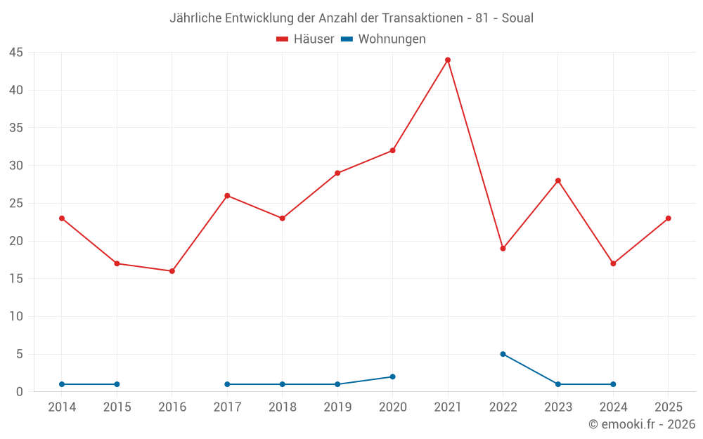 Der Durchschnittspreis auf den 23 Hausgeschäften der letzten 12 Monate in der Gemeinde Soual betrug 1 807 € pro Quadratmeter für einen mittleren Immobilienwert von 161 000 €. Über diesen Zeitraum hinweg lagen 60% der Transaktionen zwischen 878 und 2 341 € pro Quadratmeter (vom 2. bis zum 8. Dezil).