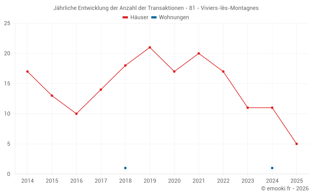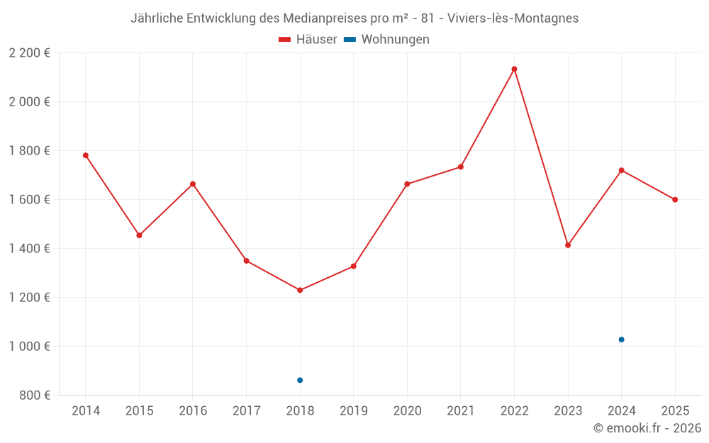 Der Durchschnittspreis auf den 23 Hausgeschäften der letzten 24 Monate in der Gemeinde Viviers-lès-Montagnes betrug 1 500 € pro Quadratmeter für einen mittleren Immobilienwert von 180 000 €. Über diesen Zeitraum hinweg lagen 60% der Transaktionen zwischen 895 und 1 806 € pro Quadratmeter (vom 2. bis zum 8. Dezil).