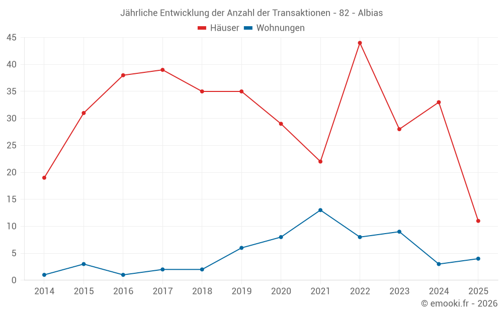 Der Durchschnittspreis auf den 28 Hausgeschäften der letzten 12 Monate in der Gemeinde Albias betrug 1 788 € pro Quadratmeter für einen mittleren Immobilienwert von 188 500 €. Über diesen Zeitraum hinweg lagen 60% der Transaktionen zwischen 1 528 und 2 183 € pro Quadratmeter (vom 2. bis zum 8. Dezil).
