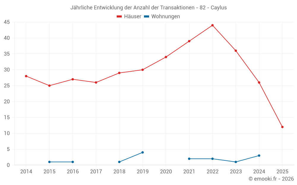 Der Durchschnittspreis auf den 26 Hausgeschäften der letzten 12 Monate in der Gemeinde Caylus betrug 1 384 € pro Quadratmeter für einen mittleren Immobilienwert von 121 810 €. Über diesen Zeitraum hinweg lagen 60% der Transaktionen zwischen 831 und 1 766 € pro Quadratmeter (vom 2. bis zum 8. Dezil).