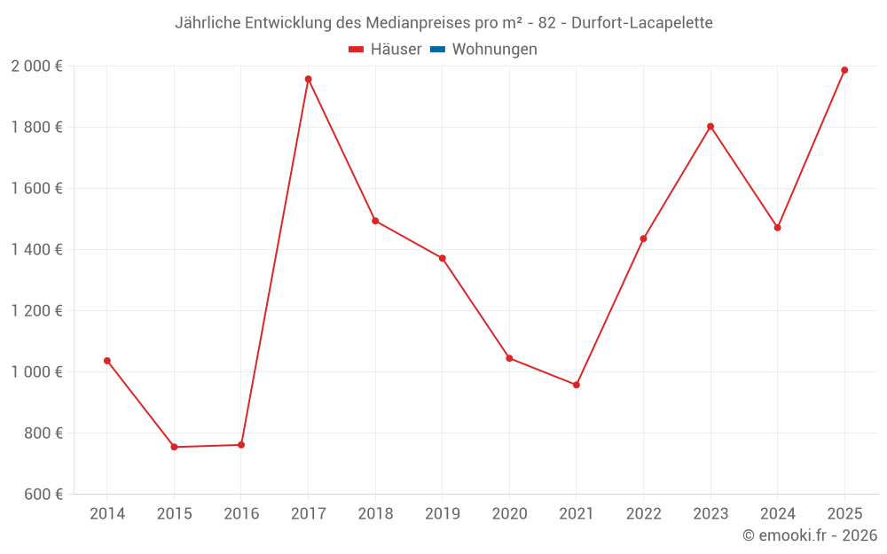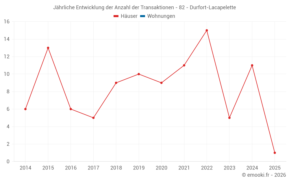 Der Durchschnittspreis auf den 15 Hausgeschäften der letzten 24 Monate in der Gemeinde Durfort-Lacapelette betrug 1 472 € pro Quadratmeter für einen mittleren Immobilienwert von 167 500 €. Über diesen Zeitraum hinweg lagen 60% der Transaktionen zwischen 1 071 und 1 915 € pro Quadratmeter (vom 2. bis zum 8. Dezil).