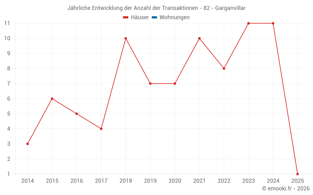 Der Durchschnittspreis auf den 19 Hausgeschäften der letzten 24 Monate in der Gemeinde Garganvillar betrug 1 583 € pro Quadratmeter für einen mittleren Immobilienwert von 150 000 €. Über diesen Zeitraum hinweg lagen 60% der Transaktionen zwischen 1 029 und 2 023 € pro Quadratmeter (vom 2. bis zum 8. Dezil).