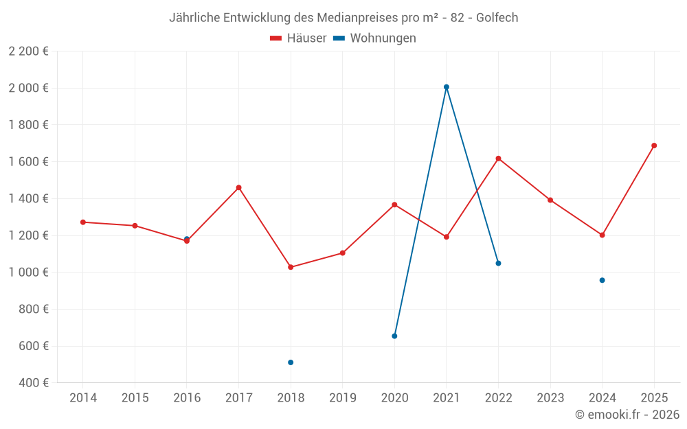 Der Durchschnittspreis auf den 14 Hausgeschäften der letzten 24 Monate in der Gemeinde Golfech betrug 1 450 € pro Quadratmeter für einen mittleren Immobilienwert von 163 000 €. Über diesen Zeitraum hinweg lagen 60% der Transaktionen zwischen 1 089 und 1 876 € pro Quadratmeter (vom 2. bis zum 8. Dezil).