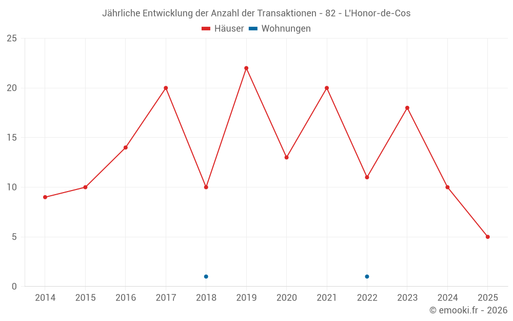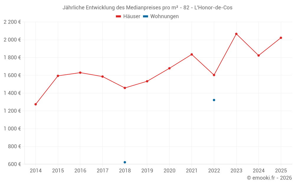 Der Durchschnittspreis auf den 26 Hausgeschäften der letzten 24 Monate in der Gemeinde L'Honor-de-Cos betrug 2 011 € pro Quadratmeter für einen mittleren Immobilienwert von 176 750 €. Über diesen Zeitraum hinweg lagen 60% der Transaktionen zwischen 1 343 und 2 581 € pro Quadratmeter (vom 2. bis zum 8. Dezil).