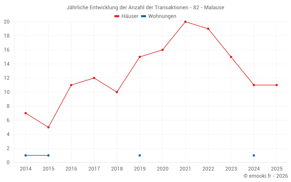 Der Durchschnittspreis auf den 16 Hausgeschäften der letzten 12 Monate in der Gemeinde Malause betrug 1 560 € pro Quadratmeter für einen mittleren Immobilienwert von 163 550 €. Über diesen Zeitraum hinweg lagen 60% der Transaktionen zwischen 1 190 und 1 867 € pro Quadratmeter (vom 2. bis zum 8. Dezil).