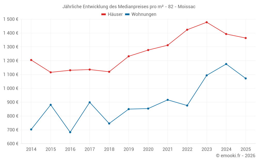 Der Durchschnittspreis auf den 26 Wohnungstransaktionen der letzten 12 Monate in der Gemeinde Moissac betrug 1 014 € pro Quadratmeter für einen mittleren Immobilienwert von 117 500 €. Über diesen Zeitraum hinweg lagen 60% der Transaktionen zwischen 753 und 1 448 € pro Quadratmeter (vom 2. bis zum 8. Dezil).