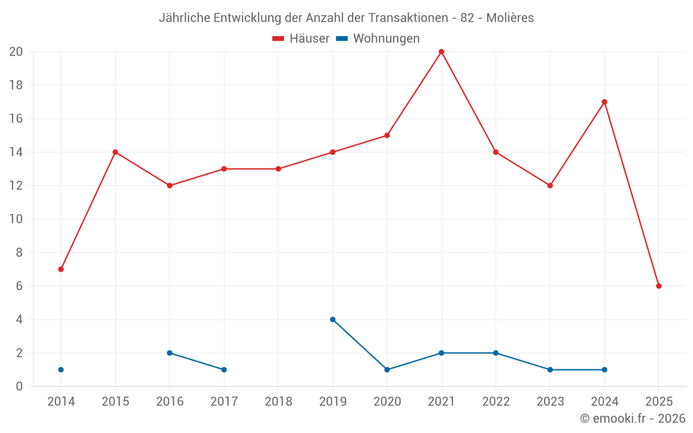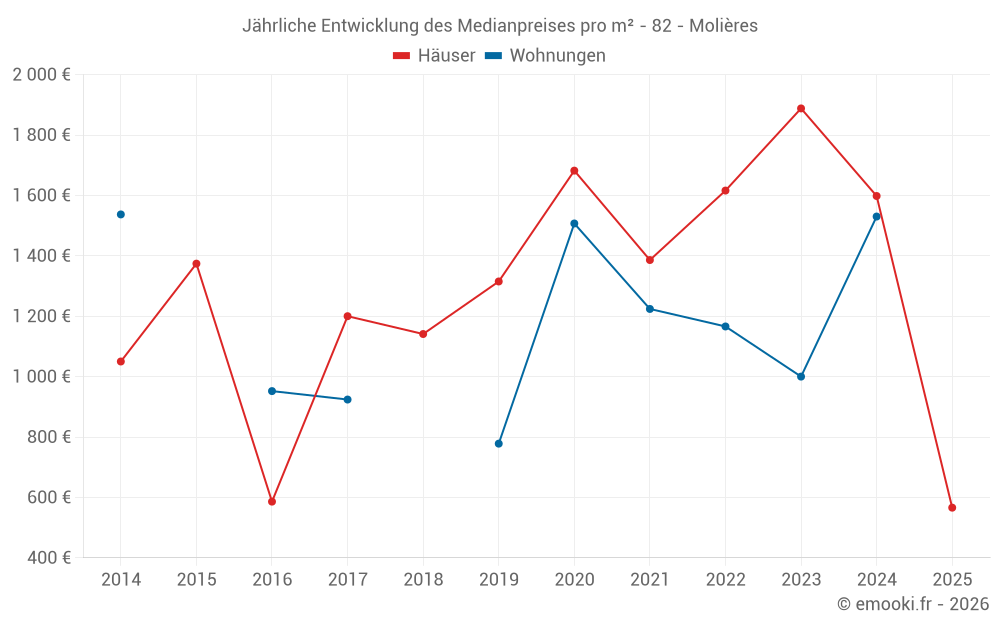 Der Durchschnittspreis auf den 18 Hausgeschäften der letzten 12 Monate in der Gemeinde Molières betrug 1 452 € pro Quadratmeter für einen mittleren Immobilienwert von 107 855 €. Über diesen Zeitraum hinweg lagen 60% der Transaktionen zwischen 557 und 2 038 € pro Quadratmeter (vom 2. bis zum 8. Dezil).