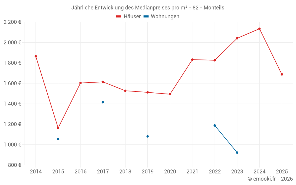 Der Durchschnittspreis auf den 22 Hausgeschäften der letzten 24 Monate in der Gemeinde Monteils betrug 1 988 € pro Quadratmeter für einen mittleren Immobilienwert von 195 000 €. Über diesen Zeitraum hinweg lagen 60% der Transaktionen zwischen 1 371 und 2 192 € pro Quadratmeter (vom 2. bis zum 8. Dezil).