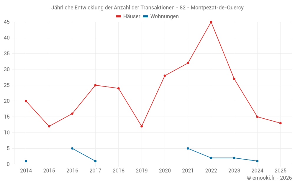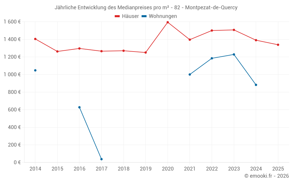 Der Durchschnittspreis auf den 21 Hausgeschäften der letzten 12 Monate in der Gemeinde Montpezat-de-Quercy betrug 1 390 € pro Quadratmeter für einen mittleren Immobilienwert von 181 000 €. Über diesen Zeitraum hinweg lagen 60% der Transaktionen zwischen 911 und 2 319 € pro Quadratmeter (vom 2. bis zum 8. Dezil).
