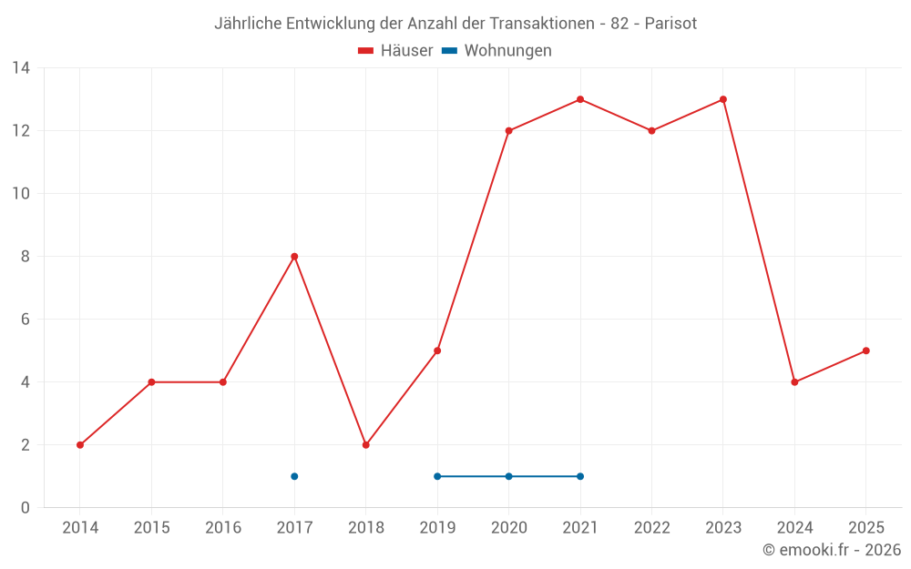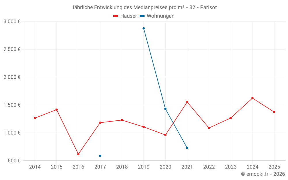Der Durchschnittspreis auf den 14 Hausgeschäften der letzten 24 Monate in der Gemeinde Parisot betrug 1 405 € pro Quadratmeter für einen mittleren Immobilienwert von 134 430 €. Über diesen Zeitraum hinweg lagen 60% der Transaktionen zwischen 935 und 2 070 € pro Quadratmeter (vom 2. bis zum 8. Dezil).