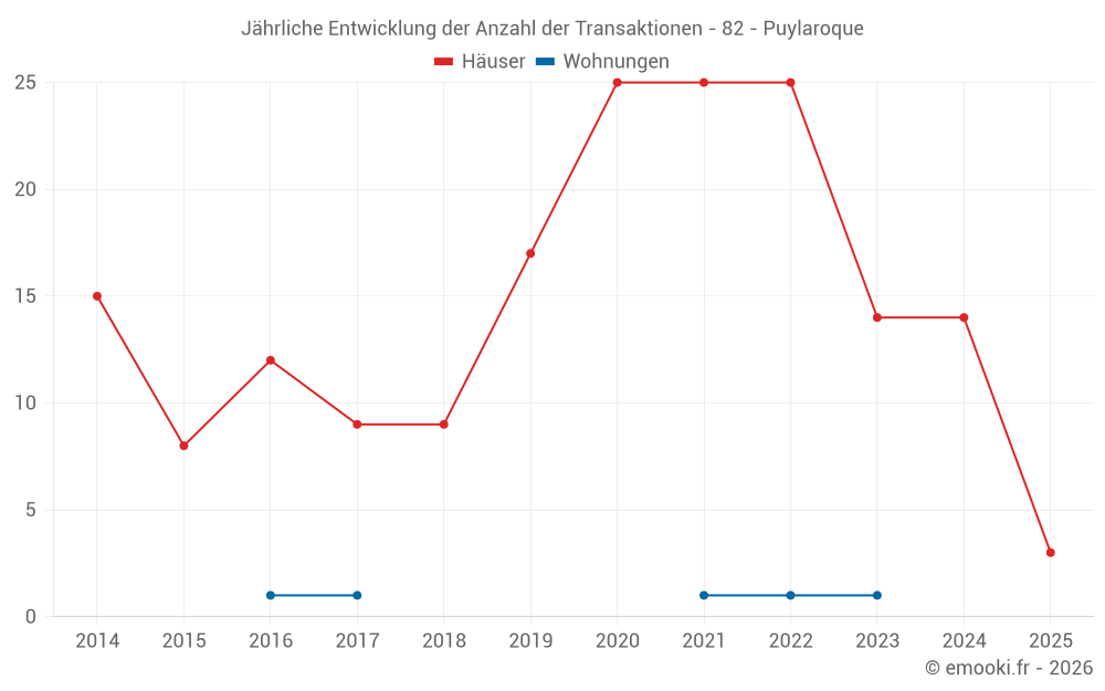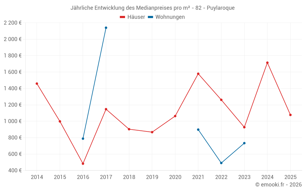 Der Durchschnittspreis auf den 25 Hausgeschäften der letzten 24 Monate in der Gemeinde Puylaroque betrug 1 596 € pro Quadratmeter für einen mittleren Immobilienwert von 132 000 €. Über diesen Zeitraum hinweg lagen 60% der Transaktionen zwischen 887 und 2 005 € pro Quadratmeter (vom 2. bis zum 8. Dezil).