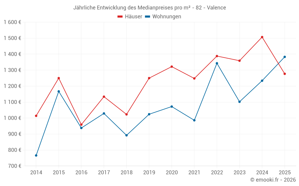 Der Durchschnittspreis auf den 21 Wohnungstransaktionen der letzten 24 Monate in der Gemeinde Valence betrug 1 335 € pro Quadratmeter für einen mittleren Immobilienwert von 73 500 €. Über diesen Zeitraum hinweg lagen 60% der Transaktionen zwischen 1 025 und 1 415 € pro Quadratmeter (vom 2. bis zum 8. Dezil).