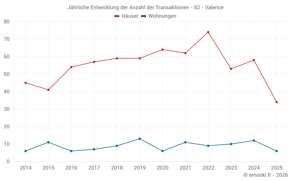 Der Durchschnittspreis auf den 34 Hausgeschäften der letzten 6 Monate in der Gemeinde Valence betrug 1 277 € pro Quadratmeter für einen mittleren Immobilienwert von 102 325 €. Über diesen Zeitraum hinweg lagen 60% der Transaktionen zwischen 862 und 1 782 € pro Quadratmeter (vom 2. bis zum 8. Dezil).