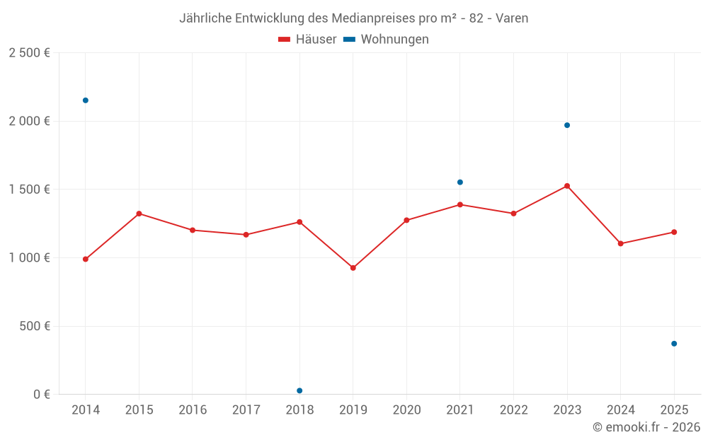 Der Durchschnittspreis auf den 38 Hausgeschäften der letzten 24 Monate in der Gemeinde Varen betrug 1 296 € pro Quadratmeter für einen mittleren Immobilienwert von 112 500 €. Über diesen Zeitraum hinweg lagen 60% der Transaktionen zwischen 964 und 1 735 € pro Quadratmeter (vom 2. bis zum 8. Dezil).