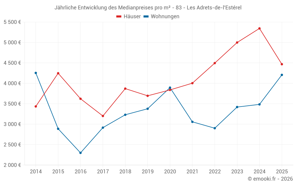 Der Durchschnittspreis auf den 36 Hausgeschäften der letzten 12 Monate in der Gemeinde Les Adrets-de-l'Estérel betrug 4 670 € pro Quadratmeter für einen mittleren Immobilienwert von 646 600 €. Über diesen Zeitraum hinweg lagen 60% der Transaktionen zwischen 3 701 und 6 955 € pro Quadratmeter (vom 2. bis zum 8. Dezil).