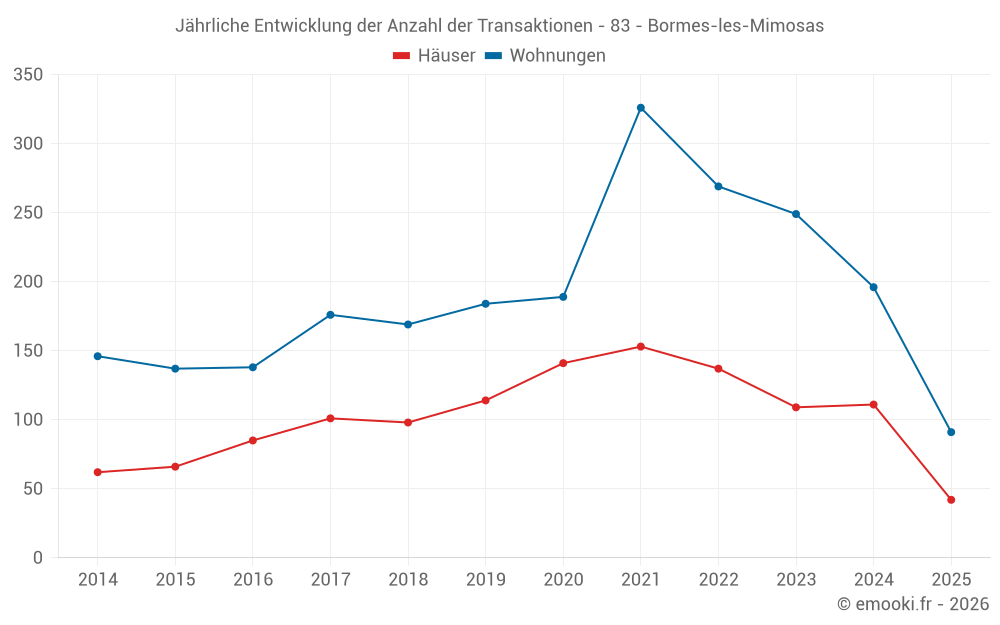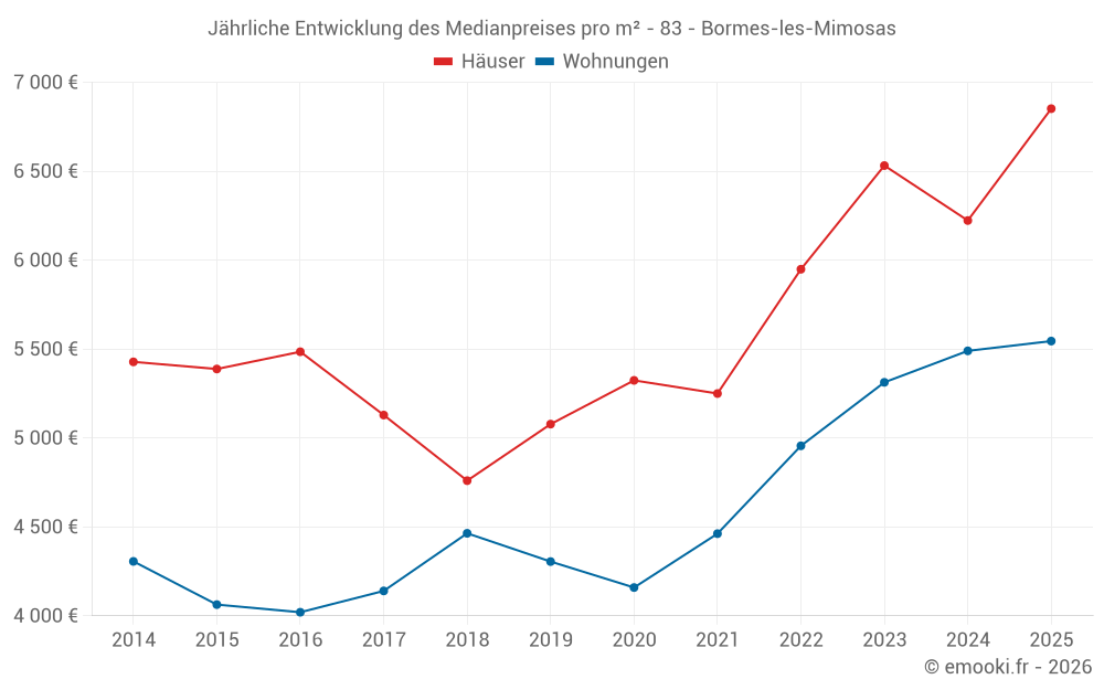 Der Durchschnittspreis auf den 48 Wohnungstransaktionen der letzten 3 Monate in der Gemeinde Bormes-les-Mimosas betrug 5 640 € pro Quadratmeter für einen mittleren Immobilienwert von 163 640 €. Über diesen Zeitraum hinweg lagen 60% der Transaktionen zwischen 4 627 und 6 449 € pro Quadratmeter (vom 2. bis zum 8. Dezil).