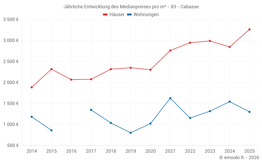 Der Durchschnittspreis auf den 32 Hausgeschäften der letzten 12 Monate in der Gemeinde Cabasse betrug 3 040 € pro Quadratmeter für einen mittleren Immobilienwert von 270 000 €. Über diesen Zeitraum hinweg lagen 60% der Transaktionen zwischen 1 606 und 4 208 € pro Quadratmeter (vom 2. bis zum 8. Dezil).