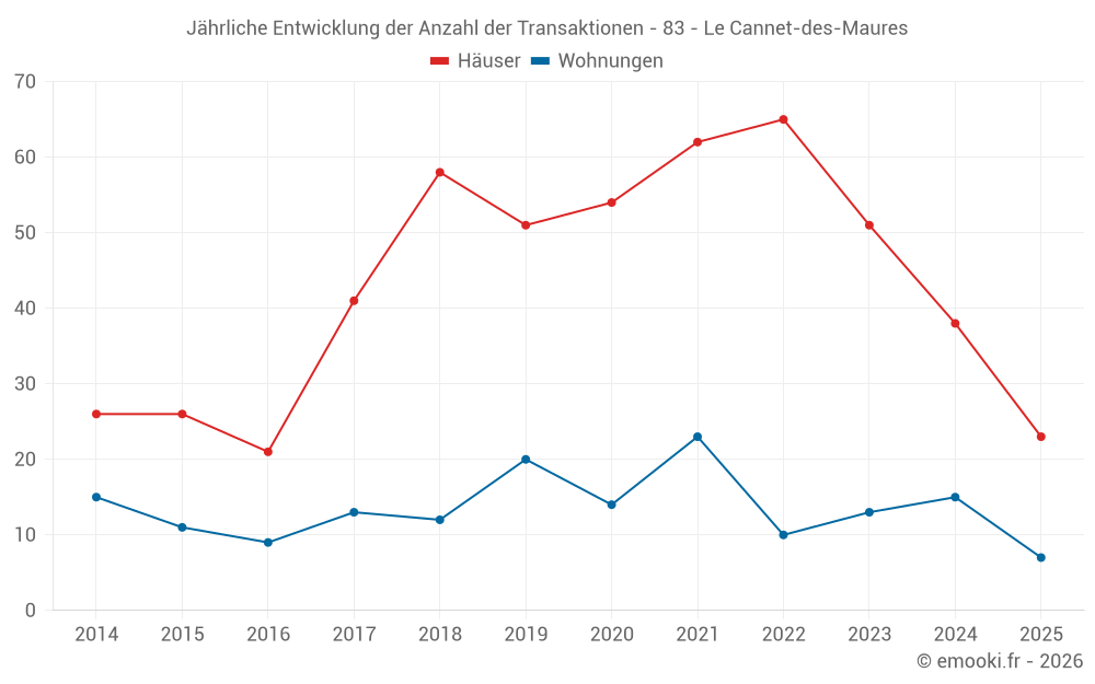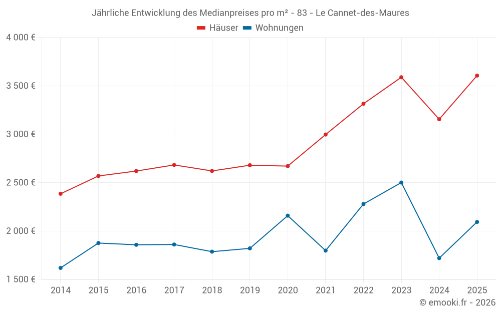 Der Durchschnittspreis auf den 23 Hausgeschäften der letzten 6 Monate in der Gemeinde Le Cannet-des-Maures betrug 3 605 € pro Quadratmeter für einen mittleren Immobilienwert von 319 000 €. Über diesen Zeitraum hinweg lagen 60% der Transaktionen zwischen 3 064 und 4 096 € pro Quadratmeter (vom 2. bis zum 8. Dezil).