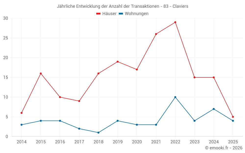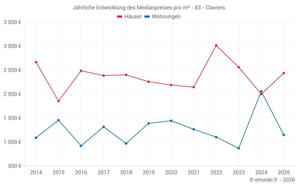 Der Durchschnittspreis auf den 27 Hausgeschäften der letzten 24 Monate in der Gemeinde Claviers betrug 2 326 € pro Quadratmeter für einen mittleren Immobilienwert von 210 000 €. Über diesen Zeitraum hinweg lagen 60% der Transaktionen zwischen 1 411 und 3 797 € pro Quadratmeter (vom 2. bis zum 8. Dezil).