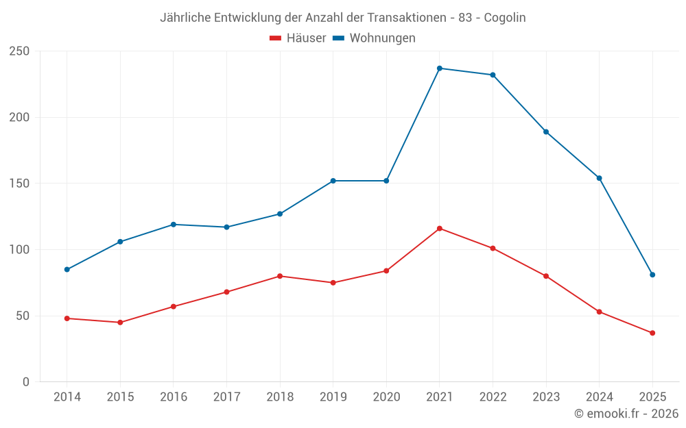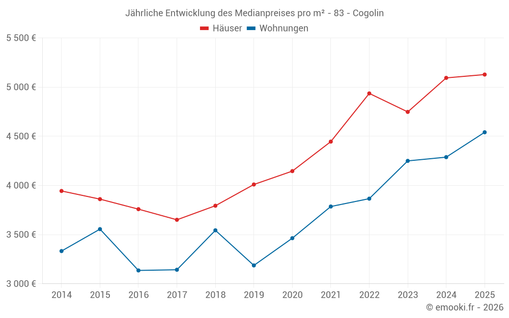 Der Durchschnittspreis auf den 37 Hausgeschäften der letzten 6 Monate in der Gemeinde Cogolin betrug 5 128 € pro Quadratmeter für einen mittleren Immobilienwert von 445 000 €. Über diesen Zeitraum hinweg lagen 60% der Transaktionen zwischen 4 171 und 6 101 € pro Quadratmeter (vom 2. bis zum 8. Dezil).
