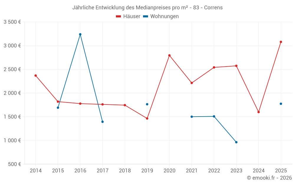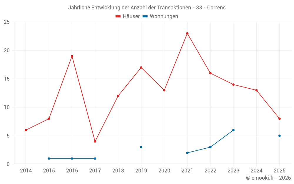 Der Durchschnittspreis auf den 29 Hausgeschäften der letzten 24 Monate in der Gemeinde Correns betrug 2 350 € pro Quadratmeter für einen mittleren Immobilienwert von 193 800 €. Über diesen Zeitraum hinweg lagen 60% der Transaktionen zwischen 1 314 und 3 511 € pro Quadratmeter (vom 2. bis zum 8. Dezil).