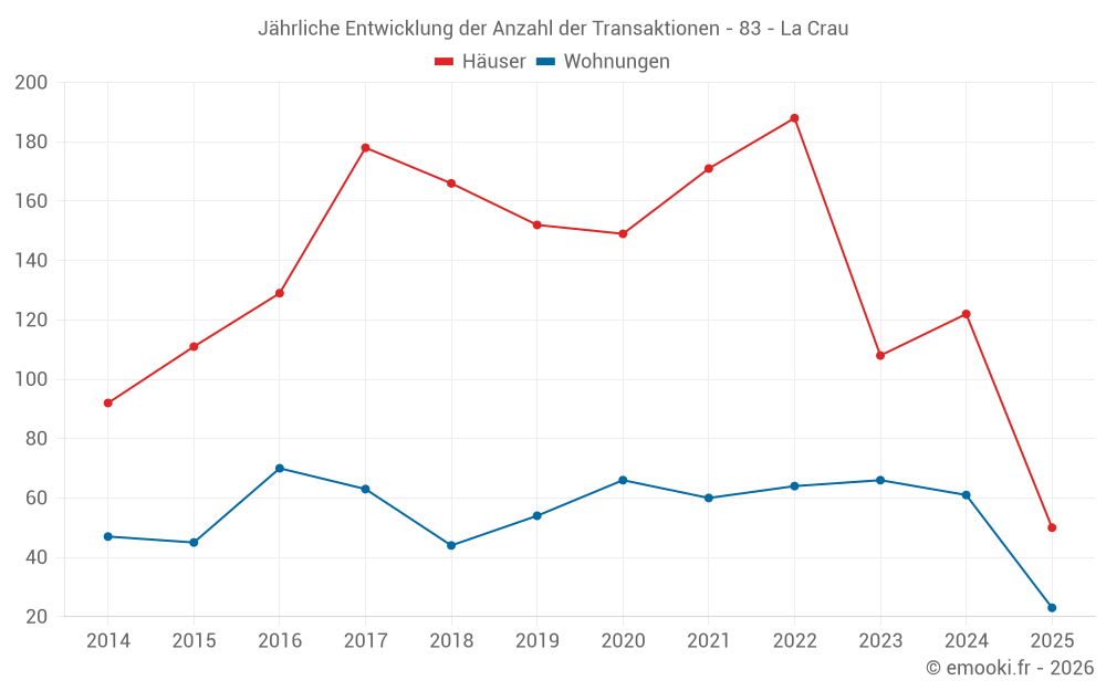 Der Durchschnittspreis auf den 50 Hausgeschäften der letzten 6 Monate in der Gemeinde La Crau betrug 4 300 € pro Quadratmeter für einen mittleren Immobilienwert von 383 725 €. Über diesen Zeitraum hinweg lagen 60% der Transaktionen zwischen 3 219 und 5 202 € pro Quadratmeter (vom 2. bis zum 8. Dezil).