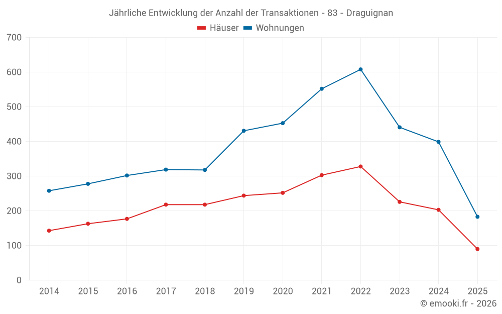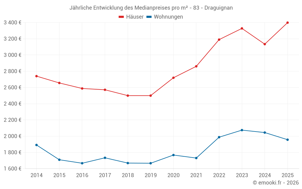 Der Durchschnittspreis auf den 37 Hausgeschäften der letzten 3 Monate in der Gemeinde Draguignan betrug 3 546 € pro Quadratmeter für einen mittleren Immobilienwert von 340 430 €. Über diesen Zeitraum hinweg lagen 60% der Transaktionen zwischen 3 002 und 3 967 € pro Quadratmeter (vom 2. bis zum 8. Dezil).