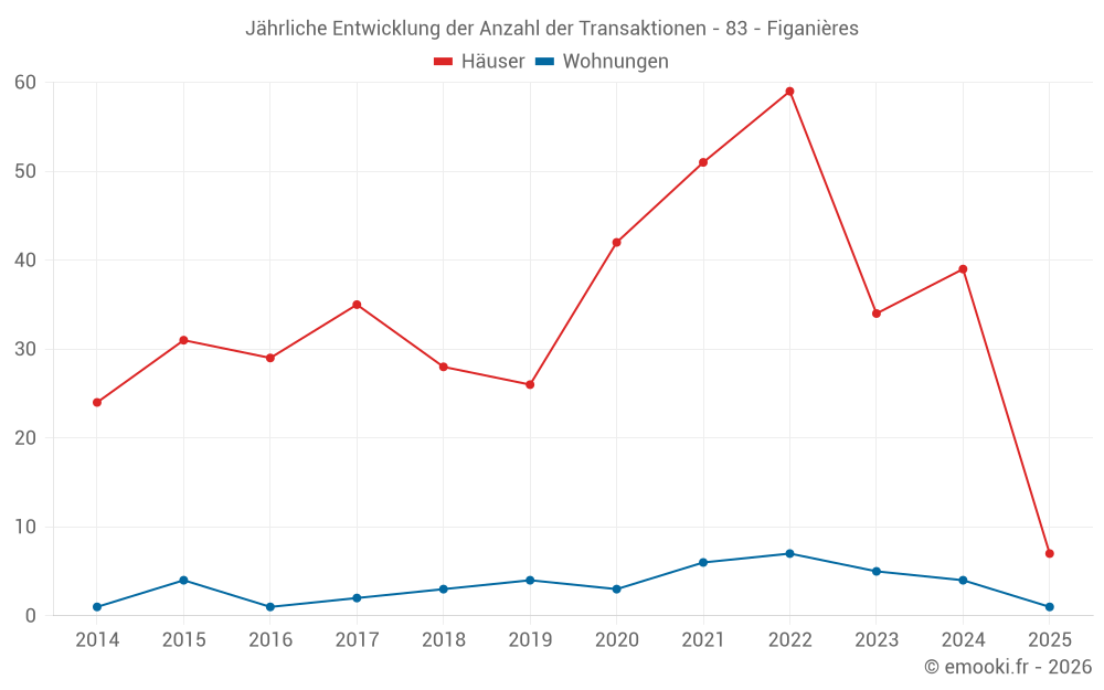 Der Durchschnittspreis auf den 32 Hausgeschäften der letzten 12 Monate in der Gemeinde Figanières betrug 3 202 € pro Quadratmeter für einen mittleren Immobilienwert von 328 000 €. Über diesen Zeitraum hinweg lagen 60% der Transaktionen zwischen 2 155 und 3 884 € pro Quadratmeter (vom 2. bis zum 8. Dezil).