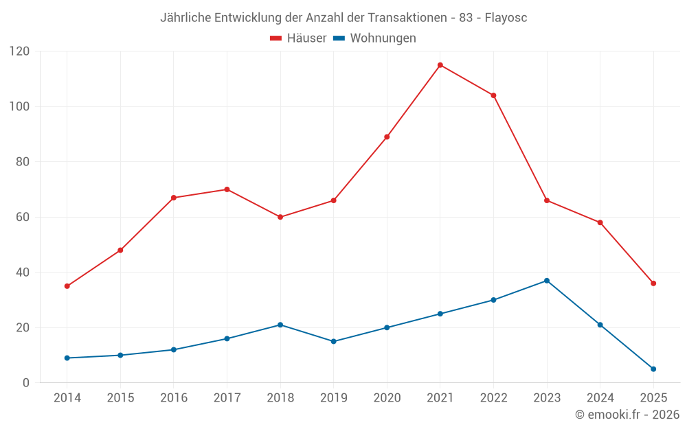 Der Durchschnittspreis auf den 36 Hausgeschäften der letzten 6 Monate in der Gemeinde Flayosc betrug 3 740 € pro Quadratmeter für einen mittleren Immobilienwert von 345 000 €. Über diesen Zeitraum hinweg lagen 60% der Transaktionen zwischen 2 555 und 4 494 € pro Quadratmeter (vom 2. bis zum 8. Dezil).