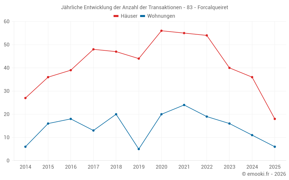 Der Durchschnittspreis auf den 18 Hausgeschäften der letzten 6 Monate in der Gemeinde Forcalqueiret betrug 3 590 € pro Quadratmeter für einen mittleren Immobilienwert von 351 010 €. Über diesen Zeitraum hinweg lagen 60% der Transaktionen zwischen 3 171 und 4 022 € pro Quadratmeter (vom 2. bis zum 8. Dezil).