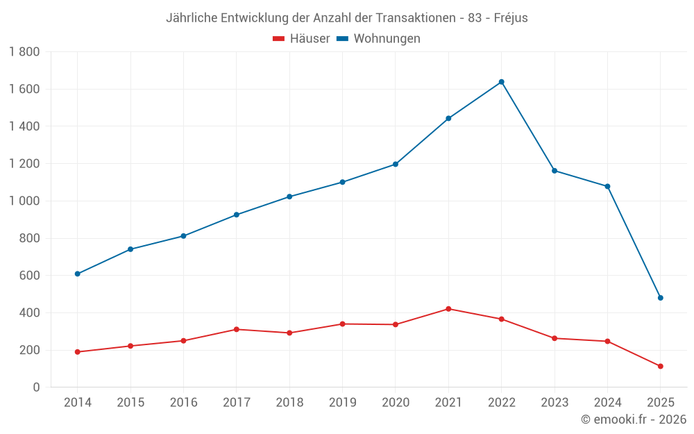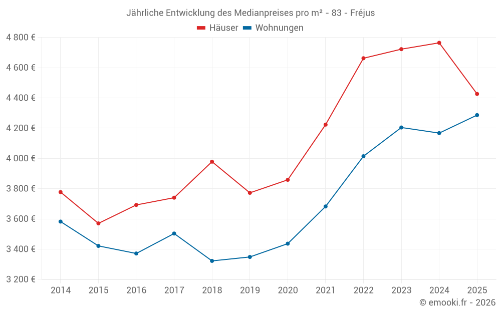 Der Durchschnittspreis auf den 231 Wohnungstransaktionen der letzten 3 Monate in der Gemeinde Fréjus betrug 4 286 € pro Quadratmeter für einen mittleren Immobilienwert von 185 000 €. Über diesen Zeitraum hinweg lagen 60% der Transaktionen zwischen 2 998 und 5 569 € pro Quadratmeter (vom 2. bis zum 8. Dezil).