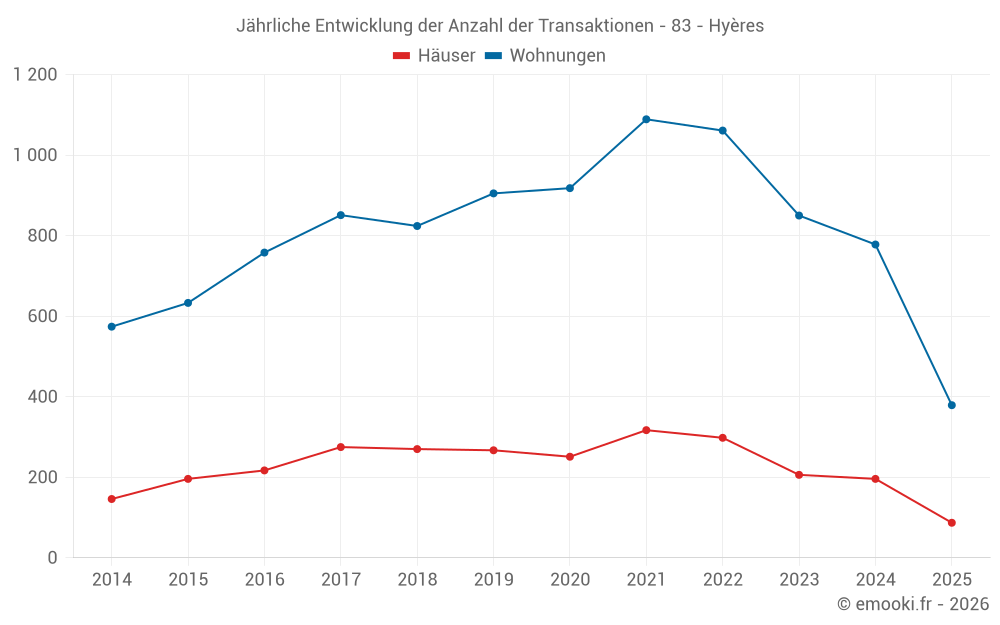 Der Durchschnittspreis auf den 40 Hausgeschäften der letzten 3 Monate in der Gemeinde Hyères betrug 5 370 € pro Quadratmeter für einen mittleren Immobilienwert von 522 350 €. Über diesen Zeitraum hinweg lagen 60% der Transaktionen zwischen 3 812 und 7 437 € pro Quadratmeter (vom 2. bis zum 8. Dezil).