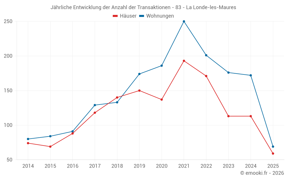 Der Durchschnittspreis auf den 25 Hausgeschäften der letzten 3 Monate in der Gemeinde La Londe-les-Maures betrug 5 475 € pro Quadratmeter für einen mittleren Immobilienwert von 470 450 €. Über diesen Zeitraum hinweg lagen 60% der Transaktionen zwischen 4 061 und 7 026 € pro Quadratmeter (vom 2. bis zum 8. Dezil).