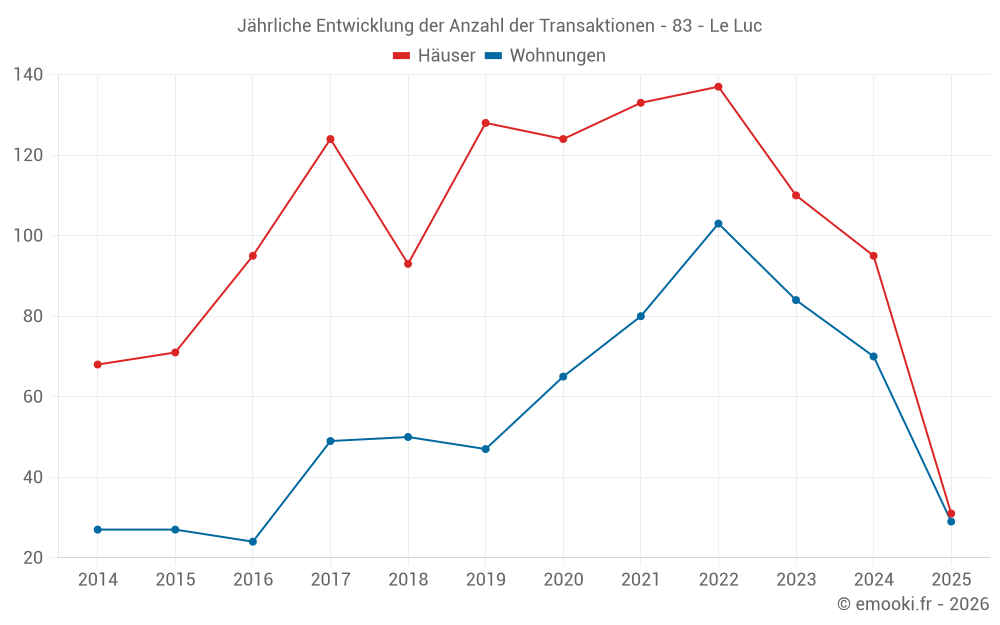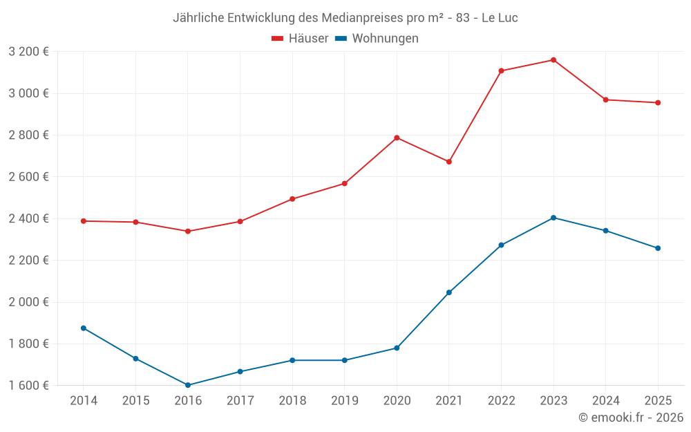 Der Durchschnittspreis auf den 31 Hausgeschäften der letzten 6 Monate in der Gemeinde Le Luc betrug 2 955 € pro Quadratmeter für einen mittleren Immobilienwert von 260 000 €. Über diesen Zeitraum hinweg lagen 60% der Transaktionen zwischen 1 365 und 3 592 € pro Quadratmeter (vom 2. bis zum 8. Dezil).