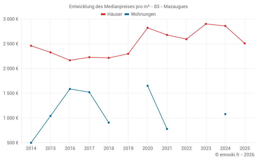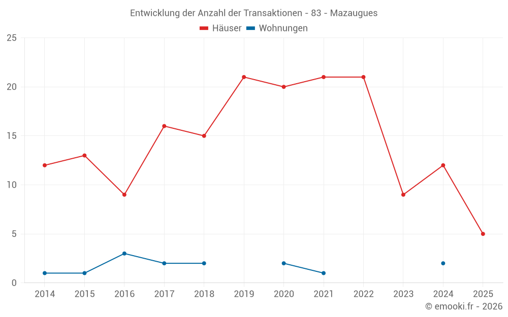 Der Durchschnittspreis auf den 21 Hausgeschäften der letzten 24 Monate in der Gemeinde Mazaugues betrug 2 714 € pro Quadratmeter für einen mittleren Immobilienwert von 220 000 €. Über diesen Zeitraum hinweg lagen 60% der Transaktionen zwischen 2 051 und 3 984 € pro Quadratmeter (vom 2. bis zum 8. Dezil).