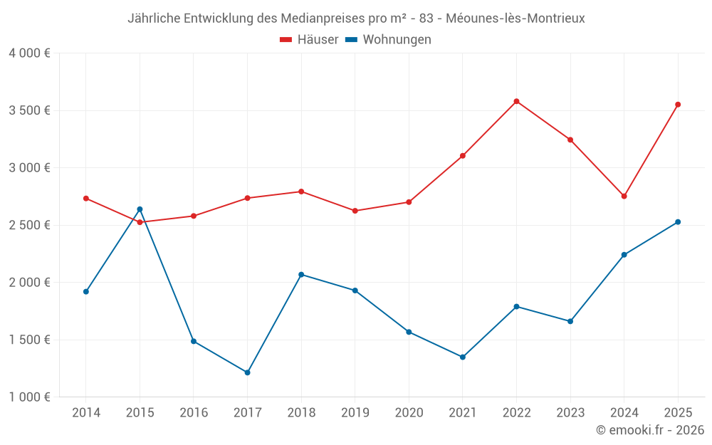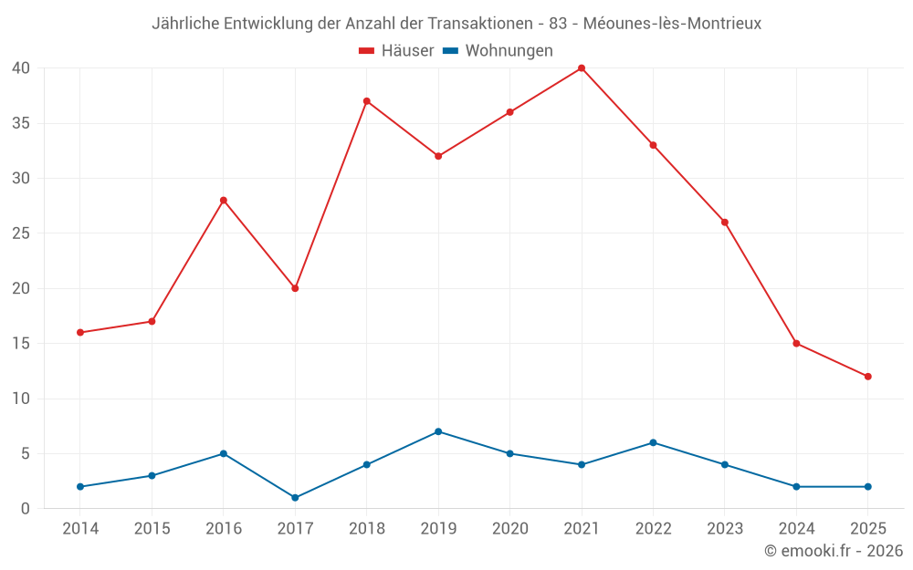 Der Durchschnittspreis auf den 25 Hausgeschäften der letzten 12 Monate in der Gemeinde Méounes-lès-Montrieux betrug 3 350 € pro Quadratmeter für einen mittleren Immobilienwert von 328 000 €. Über diesen Zeitraum hinweg lagen 60% der Transaktionen zwischen 2 062 und 4 319 € pro Quadratmeter (vom 2. bis zum 8. Dezil).