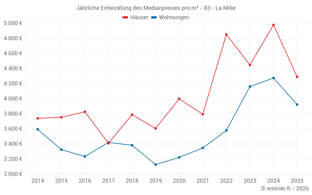Der Durchschnittspreis auf den 20 Wohnungstransaktionen der letzten 24 Monate in der Gemeinde La Môle betrug 4 208 € pro Quadratmeter für einen mittleren Immobilienwert von 258 500 €. Über diesen Zeitraum hinweg lagen 60% der Transaktionen zwischen 3 769 und 4 418 € pro Quadratmeter (vom 2. bis zum 8. Dezil).