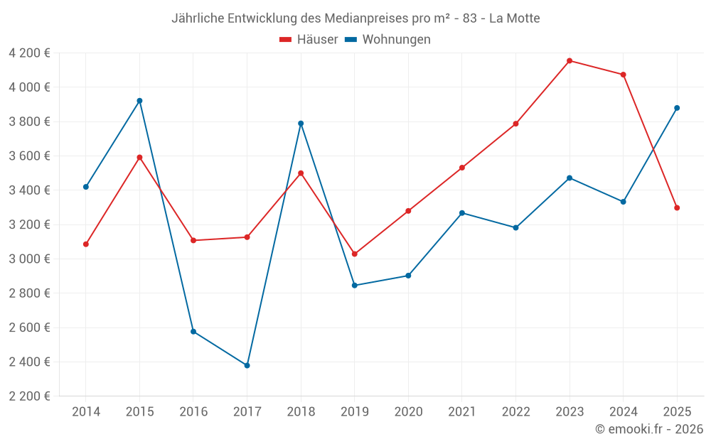 Der Durchschnittspreis auf den 22 Wohnungstransaktionen der letzten 12 Monate in der Gemeinde La Motte betrug 3 459 € pro Quadratmeter für einen mittleren Immobilienwert von 190 170 €. Über diesen Zeitraum hinweg lagen 60% der Transaktionen zwischen 2 615 und 4 459 € pro Quadratmeter (vom 2. bis zum 8. Dezil).