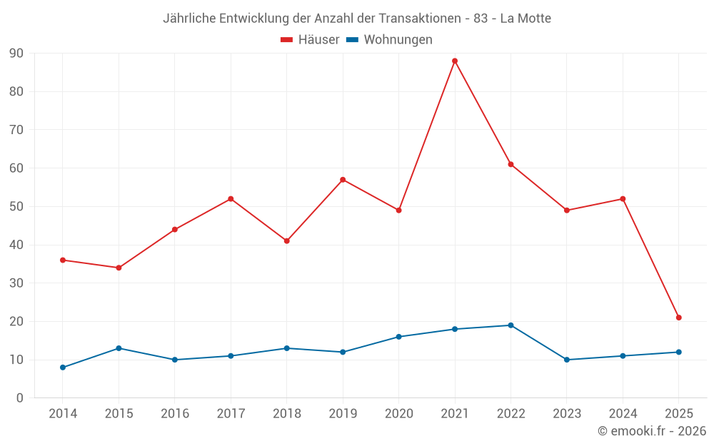 Der Durchschnittspreis auf den 21 Hausgeschäften der letzten 6 Monate in der Gemeinde La Motte betrug 3 298 € pro Quadratmeter für einen mittleren Immobilienwert von 323 000 €. Über diesen Zeitraum hinweg lagen 60% der Transaktionen zwischen 2 414 und 4 843 € pro Quadratmeter (vom 2. bis zum 8. Dezil).