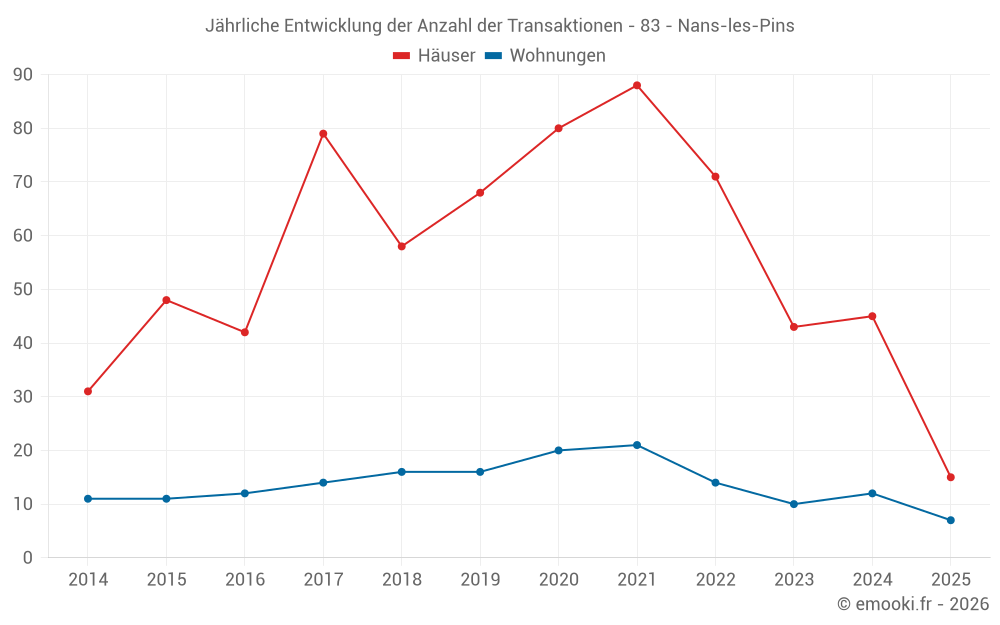 Der Durchschnittspreis auf den 41 Hausgeschäften der letzten 12 Monate in der Gemeinde Nans-les-Pins betrug 4 056 € pro Quadratmeter für einen mittleren Immobilienwert von 395 000 €. Über diesen Zeitraum hinweg lagen 60% der Transaktionen zwischen 3 040 und 4 733 € pro Quadratmeter (vom 2. bis zum 8. Dezil).
