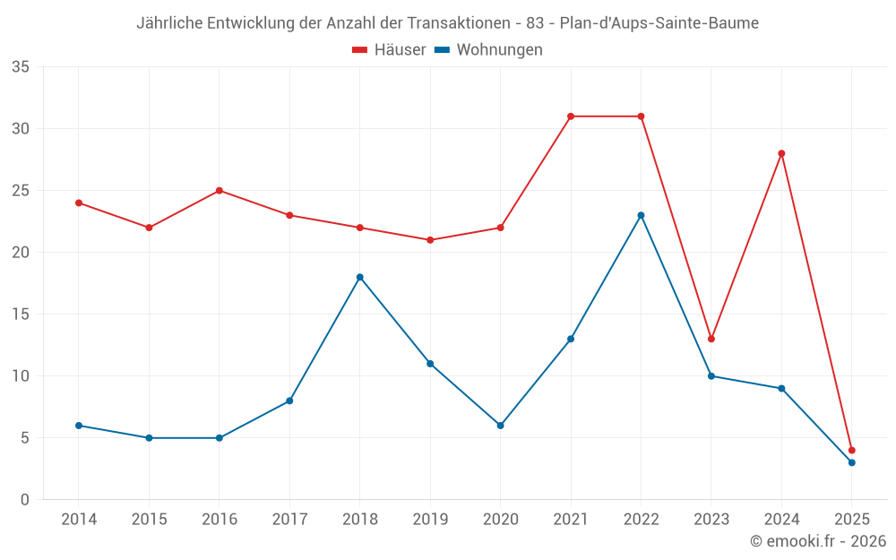 Der Durchschnittspreis auf den 14 Wohnungstransaktionen der letzten 24 Monate in der Gemeinde Plan-d'Aups-Sainte-Baume betrug 2 928 € pro Quadratmeter für einen mittleren Immobilienwert von 141 855 €. Über diesen Zeitraum hinweg lagen 60% der Transaktionen zwischen 2 404 und 3 450 € pro Quadratmeter (vom 2. bis zum 8. Dezil).