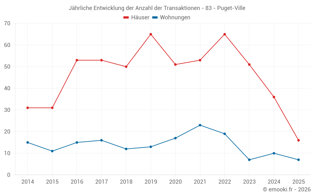 Der Durchschnittspreis auf den 19 Wohnungstransaktionen der letzten 24 Monate in der Gemeinde Puget-Ville betrug 2 649 € pro Quadratmeter für einen mittleren Immobilienwert von 122 000 €. Über diesen Zeitraum hinweg lagen 60% der Transaktionen zwischen 1 697 und 3 411 € pro Quadratmeter (vom 2. bis zum 8. Dezil).