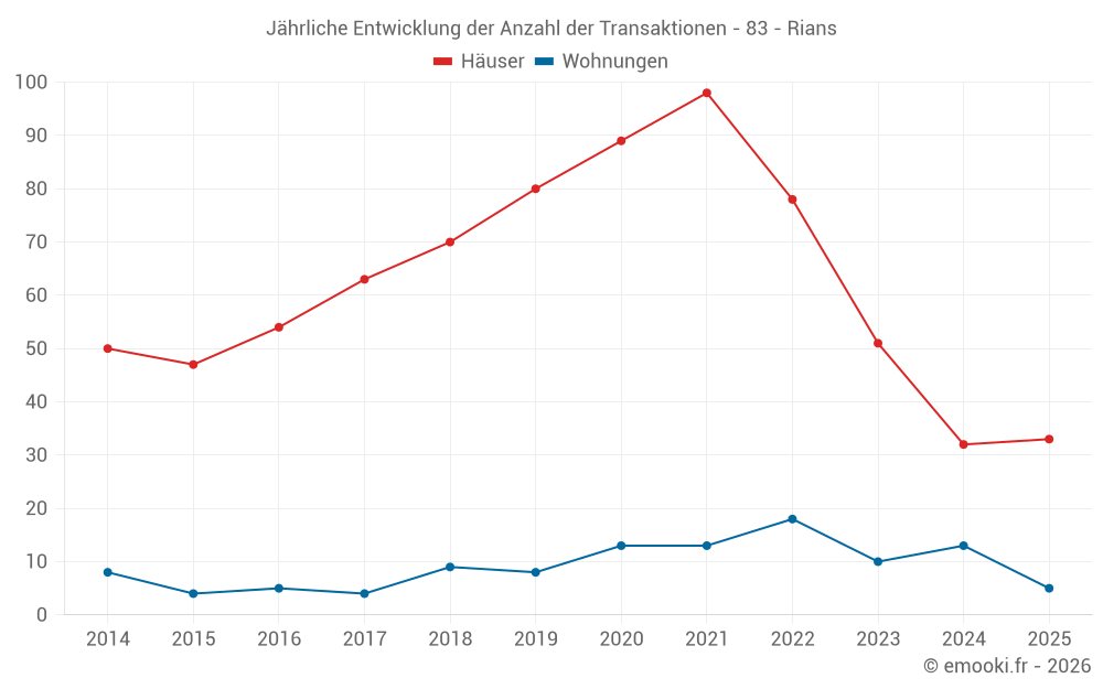 Der Durchschnittspreis auf den 23 Wohnungstransaktionen der letzten 24 Monate in der Gemeinde Rians betrug 1 784 € pro Quadratmeter für einen mittleren Immobilienwert von 115 000 €. Über diesen Zeitraum hinweg lagen 60% der Transaktionen zwischen 1 219 und 2 452 € pro Quadratmeter (vom 2. bis zum 8. Dezil).