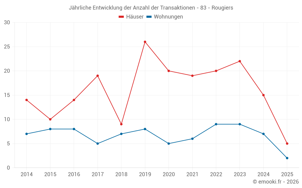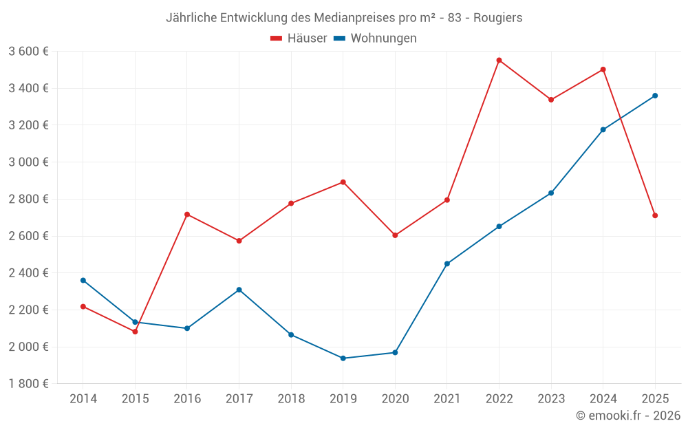 Der Durchschnittspreis auf den 14 Wohnungstransaktionen der letzten 24 Monate in der Gemeinde Rougiers betrug 2 837 € pro Quadratmeter für einen mittleren Immobilienwert von 129 000 €. Über diesen Zeitraum hinweg lagen 60% der Transaktionen zwischen 1 906 und 3 710 € pro Quadratmeter (vom 2. bis zum 8. Dezil).
