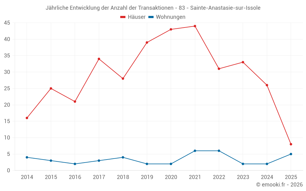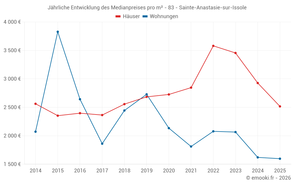 Der Durchschnittspreis auf den 22 Hausgeschäften der letzten 12 Monate in der Gemeinde Sainte-Anastasie-sur-Issole betrug 3 069 € pro Quadratmeter für einen mittleren Immobilienwert von 242 950 €. Über diesen Zeitraum hinweg lagen 60% der Transaktionen zwischen 2 186 und 4 701 € pro Quadratmeter (vom 2. bis zum 8. Dezil).