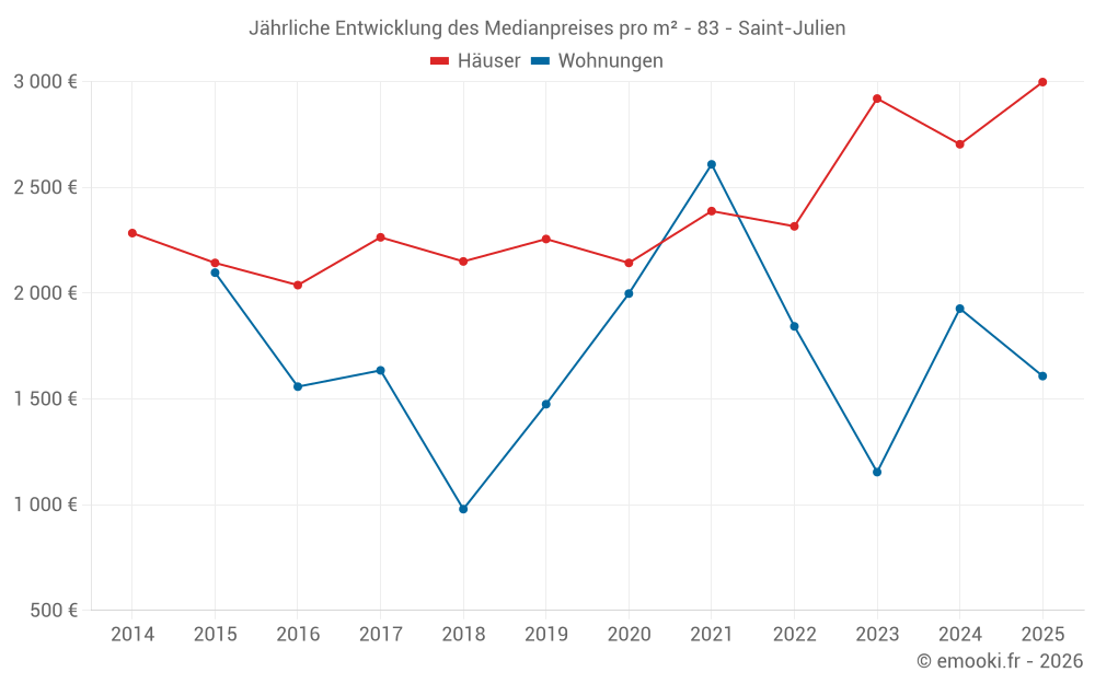 Der Durchschnittspreis auf den 21 Hausgeschäften der letzten 6 Monate in der Gemeinde Saint-Julien betrug 2 998 € pro Quadratmeter für einen mittleren Immobilienwert von 214 100 €. Über diesen Zeitraum hinweg lagen 60% der Transaktionen zwischen 2 424 und 4 204 € pro Quadratmeter (vom 2. bis zum 8. Dezil).