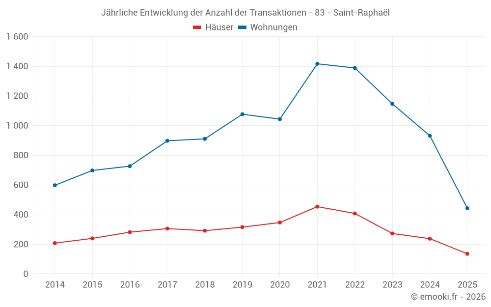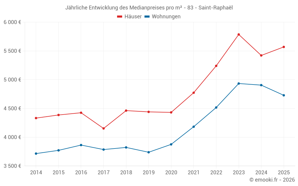 Der Durchschnittspreis auf den 57 Hausgeschäften der letzten 3 Monate in der Gemeinde Saint-Raphaël betrug 5 556 € pro Quadratmeter für einen mittleren Immobilienwert von 684 000 €. Über diesen Zeitraum hinweg lagen 60% der Transaktionen zwischen 4 204 und 7 801 € pro Quadratmeter (vom 2. bis zum 8. Dezil).