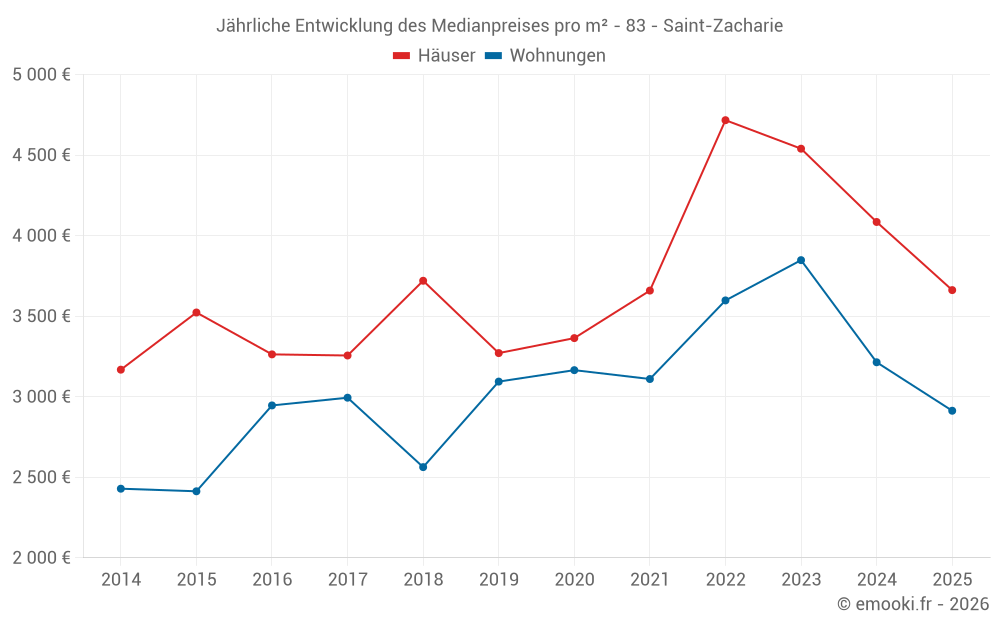 Der Durchschnittspreis auf den 22 Hausgeschäften der letzten 6 Monate in der Gemeinde Saint-Zacharie betrug 3 662 € pro Quadratmeter für einen mittleren Immobilienwert von 415 000 €. Über diesen Zeitraum hinweg lagen 60% der Transaktionen zwischen 2 619 und 4 305 € pro Quadratmeter (vom 2. bis zum 8. Dezil).