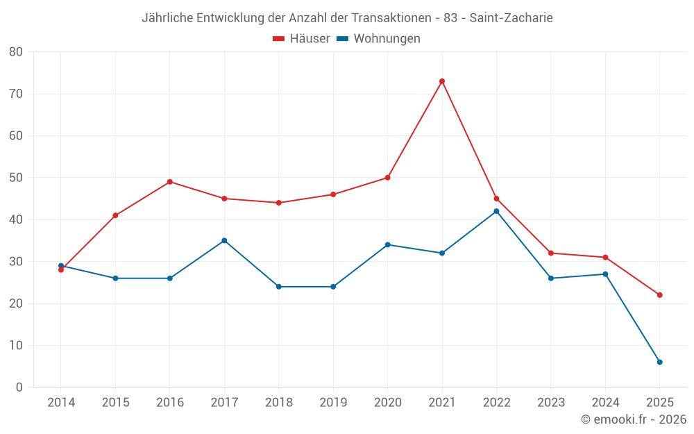 Der Durchschnittspreis auf den 22 Wohnungstransaktionen der letzten 12 Monate in der Gemeinde Saint-Zacharie betrug 3 248 € pro Quadratmeter für einen mittleren Immobilienwert von 186 500 €. Über diesen Zeitraum hinweg lagen 60% der Transaktionen zwischen 1 751 und 4 108 € pro Quadratmeter (vom 2. bis zum 8. Dezil).